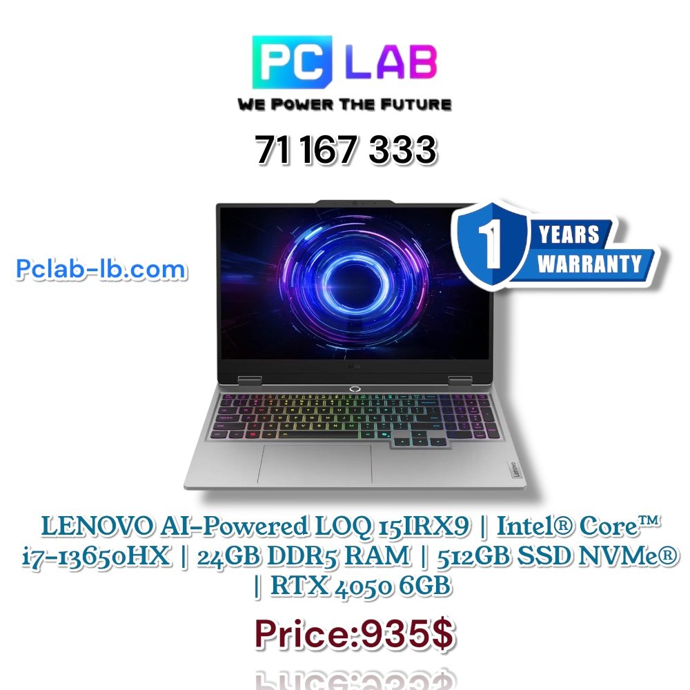 LENOVO AI-Powered LOQ 15IRX9 | Intel® Core™ i7-13650HX | 24GB DDR5 RAM | 512GB SSD NVMe® | RTX 4050 6GB | 15.6″ FHD IPS 144Hz | White Backlit Keyboard | Luna Grey | DOS