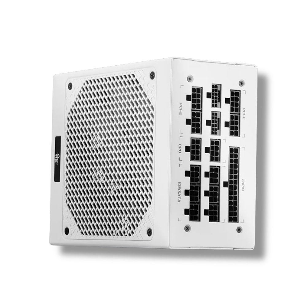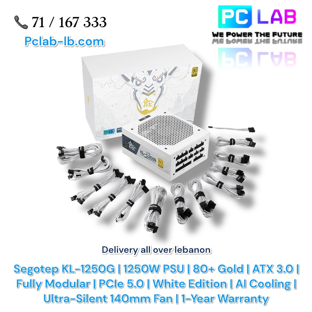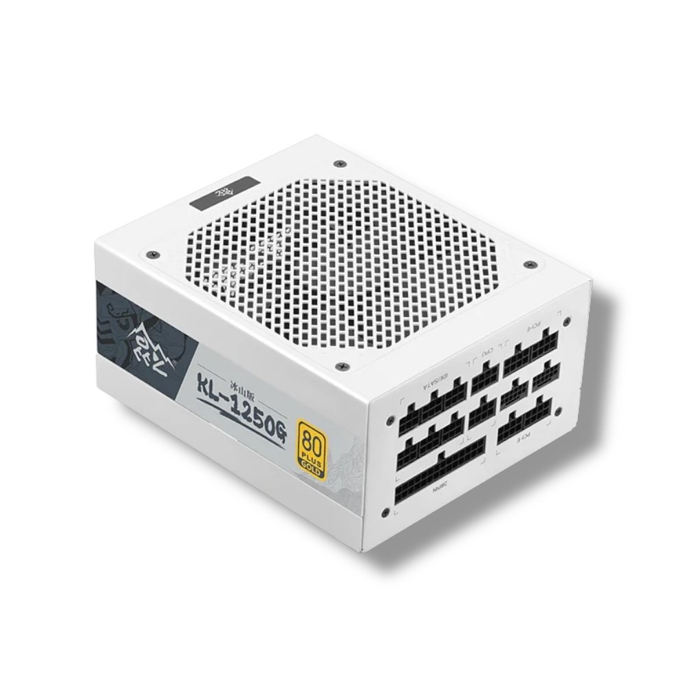 ▸ SKU: KL-1250G-ATX3.0-WH ▸ Model: Segotep KL-1250G White Edition ▸ Wattage: 1250W ▸ Certification: 80 Plus Gold ▸ Efficiency: Up to 93.28% at 50% load (230V) ▸ Form Factor: ATX 3.0 ▸ Cabling: Fully Modular ▸ Connectors: 1 × 16-pin PCIe 5.0 | 6 × 8-pin PCIe (6+2) ▸ Cooling System: AI Smart Cooling with 140mm Ultra-Silent Fan ▸ Voltage Range: 96V – 264V ▸ Color: White ▸ Certifications: CCC, CE ▸ Warranty: 1 Year