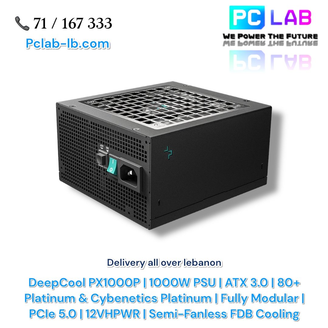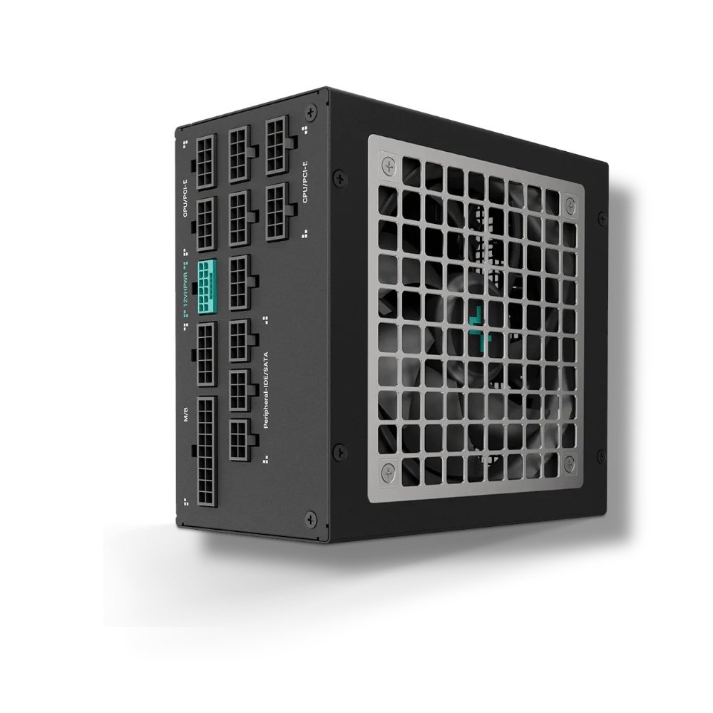 ▸ SKU: R-PXA00P-FC0B-EU ▸ Model: DeepCool PX1000P ▸ Form Factor: ATX12V v3.0 ▸ Wattage: 1000W Continuous Output ▸ Certification: 80 Plus Platinum / Cybenetics Platinum ▸ Efficiency: ≥92% @ 50% load ▸ Fan: 120mm FDB (Fluid Dynamic Bearing) | Semi-Fanless ▸ Topology: Interleaved PFC, Full-Bridge & LLC + DC to DC ▸ Capacitors: 100% Japanese Electrolytic 105°C ▸ Power Good Signal: 100–150ms ▸ Hold-Up Time: ≥16ms @ full load ▸ Protections: OPP / OVP / SCP / OTP / OCP / UVP / NLO / SIP ▸ Connectors: 1× 24-pin | 2× CPU (4+4) | 5× PCIe (6+2) | 1× 12VHPWR (16-pin) | 2× SATA | 1× Peripheral (4-pin) ▸ Dimensions (W×L×H): 150 × 160 × 86 mm ▸ Operating Temp: 0 – 50°C ▸ MTBF: 100,000 hours ▸ Regulatory: CE / FCC / CCC / TUV-RH / UKCA / BIS / RoHS / WEEE ▸ Color: Black ▸ Warranty: 1 Year