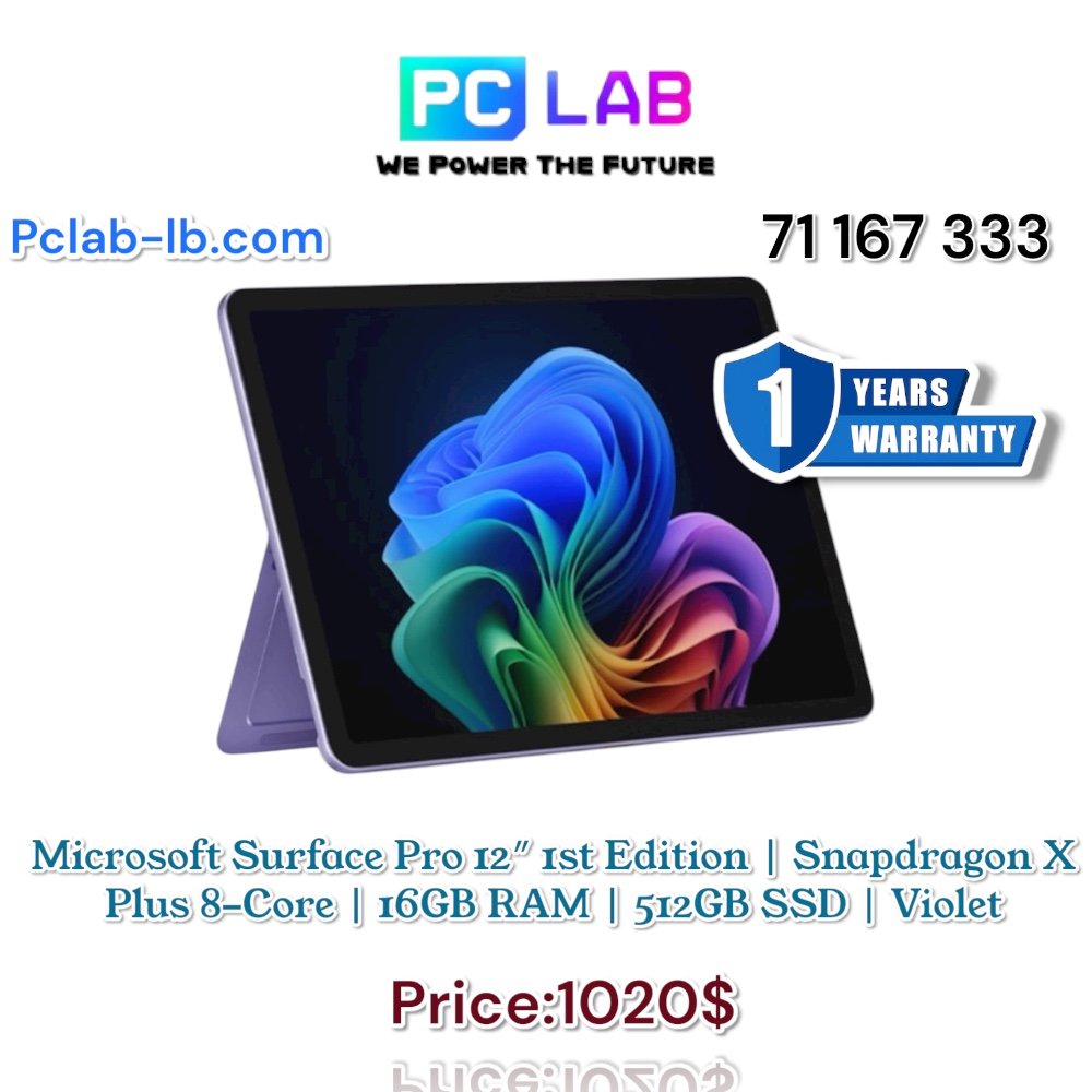 ▸ SKU: EP2-27738 ▸ Model: Microsoft Surface Pro 12″ 1st Edition ▸ Display: 12″ PixelSense Touchscreen ▸ Processor: Qualcomm Snapdragon X Plus (8-Core) ▸ Memory: 16GB RAM ▸ Storage: 512GB SSD ▸ Graphics: Integrated Qualcomm Adreno GPU ▸ Operating System: Windows 11 Copilot+ Ready ▸ Color: Violet ▸ Form Factor: 2-in-1 Detachable Tablet/Laptop ▸ Battery Life: All-day usage (varies by workload) ▸ Connectivity: Wi-Fi, Bluetooth, Surface accessories support ▸ Audio & Camera: Dual Studio Mics, HD front & rear cameras ▸ Weight: Lightweight and portable