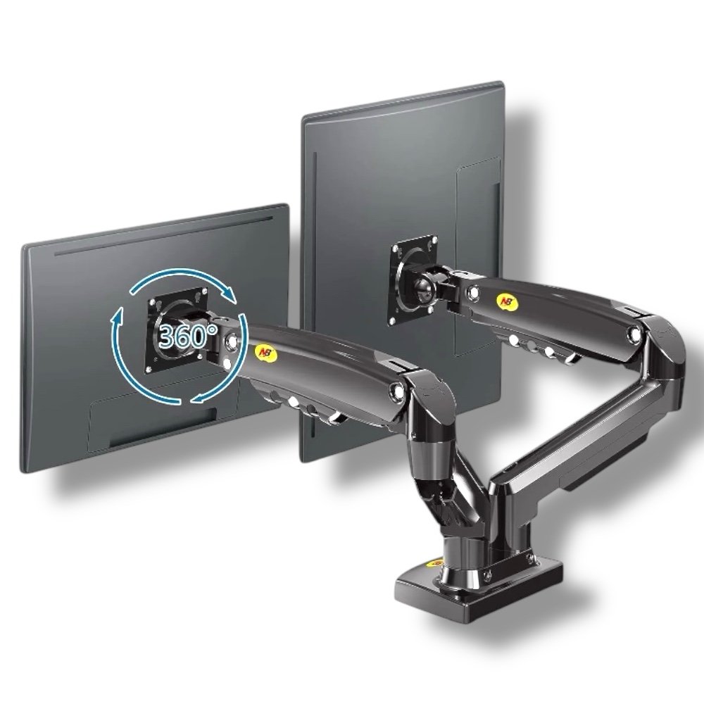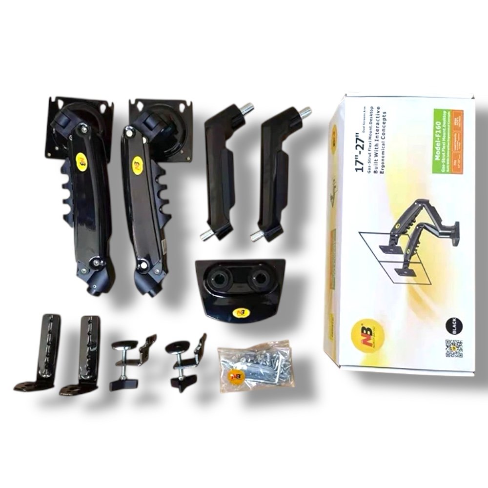▸ SKU: NB-F160 ▸ Model: F160 Dual Monitor Gas Spring Mount ▸ Screen Compatibility: 17″ – 27″ (×2) ▸ Supported Load: 2 – 9 kg (×2) | 4.4 – 19.8 lb (×2) ▸ VESA Mount: 75×75 mm / 100×100 mm (×2) ▸ Lift Range: 10″ (260 mm) ▸ Rotation: 360° ▸ Swivel: ±180° ▸ Tilt Angle: +85° to −30° ▸ Mount Options: C-Clamp / Grommet ▸ Desk Hole Diameter: 0.39″ – 1.97″ (10 – 50 mm) ▸ Desk Thickness Support: ≤ 3.54″ (90 mm) ▸ Material / Color: High-grade steel / Black ▸ Installation Time: ≈ 10 minutes ▸ Package Contents: Mount Arms, VESA Plates, Hardware Kit, User Manual