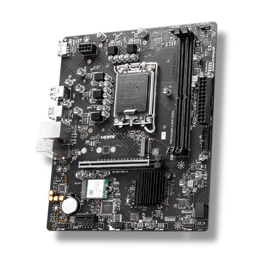 ▸ SKU: 911-7E44-010 ▸ Chipset: Intel® H610 ▸ CPU Support: Intel® Core™ 14th / 13th / 12th Gen, Pentium® Gold & Celeron® (LGA 1700) ▸ Memory: 2× DDR4 slots | Up to 64GB | Dual Channel | 1866–3200MHz (JEDEC) | Non-ECC, unbuffered ▸ Onboard Graphics: 1× HDMI™ 1.4 (4K@30Hz, HDR) — depends on CPU with iGPU ▸ Expansion Slots: 1× PCIe 4.0 x16 | 1× PCIe 3.0 x1 ▸ Audio: Realtek® ALC897 | 7.1-Channel High Definition Audio ▸ Storage: 1× M.2 (PCIe 3.0 x4, 2280/2260/2242) | 2× SATA 6Gb/s ▸ USB Ports: Rear — 2× USB 3.2 Gen1, 4× USB 2.0 | Front — 2× USB 3.2 Gen1, 4× USB 2.0 ▸ LAN: Realtek® RTL8111H Gigabit LAN ▸ Internal I/O: ATX_PWR, CPU_PWR, CPU Fan, System Fan, JFP, JCI, JAUD, JCOM, TPM 2.0 header, USB 2.0 header ▸ LED Feature: 4× EZ Debug LED ▸ Back Panel Ports: HDMI™, USB 3.2 Gen1, USB 2.0, LAN, Audio Connectors ▸ Operating System: Windows® 11 / 10 (64-bit) ▸ PCB Form Factor: mATX (200mm × 236.16mm)