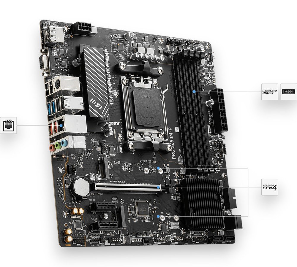 MSI PRO B650M-P ProSeries Motherboard | Micro-ATX | Supports AMD Ryzen™ 9000 / 8000 / 7000 Series Desktop Processors | DDR5 Memory Boost 6000+MHz (OC) | PCIe 4.0 | M.2 | SATA 6Gb/s | USB 3.2 Gen2 | HDMI & DP | 2.5G LAN | 1-Year Warranty Color: black