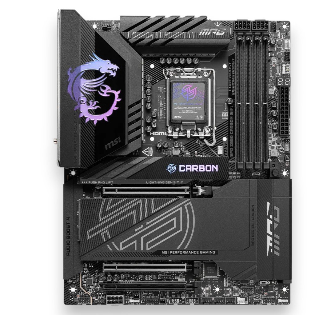 MSI MPG Z890 Carbon WiFi ATX Motherboard | Intel® Z890 Chipset | Supports Intel® Core™ Ultra Series 2 Processors (LGA 1851) | 4× DDR5 UDIMM 9200+ MT/s (OC) | 3× PCIe x16 (Gen 5.0/4.0) | 5× M.2 Slots + 4× SATA 6Gb/s | Killer™ 5G LAN & Intel® 2.5G LAN | Wi-Fi 7 | Bluetooth 5.4 | Thunderbolt™ 4 | Realtek® ALC1220P Audio | 1-Year Warranty
