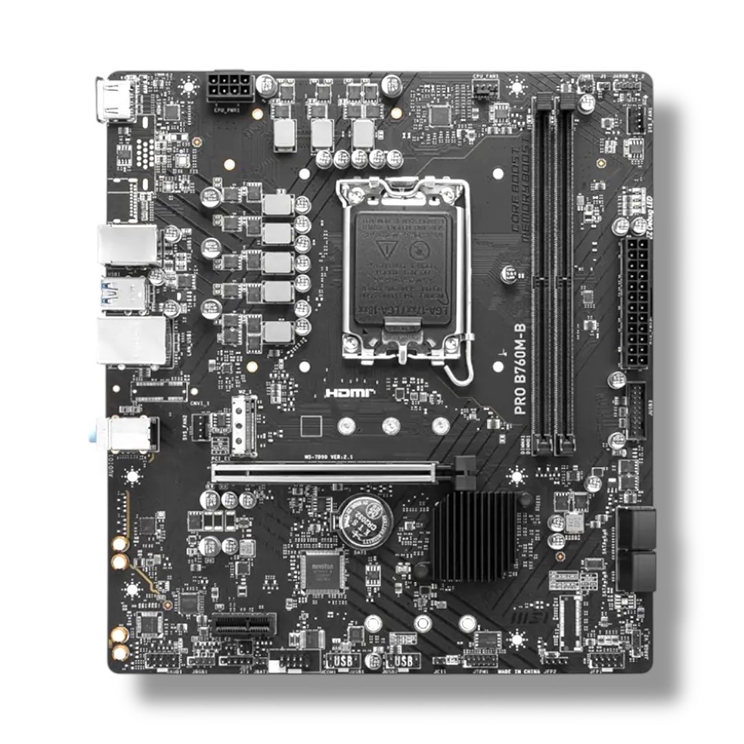 ▸ SKU: 911-7D90-054 ▸ Model: MSI PRO B760M-B DDR5 ▸ Chipset: Intel® B760 ▸ CPU Socket: LGA 1700 ▸ CPU Support: Intel® 14th / 13th / 12th Gen, Pentium® Gold, Celeron® ▸ Memory Support: – 2× DDR5 DIMM, up to 128GB – DDR5 6400+ MHz (OC) / 4800–5600 MHz (JEDEC) – Dual-Channel, non-ECC, Intel® XMP 3.0 ▸ Expansion Slots: – 1× PCIe 4.0 x16 (Steel Armor) – 1× PCIe x1 ▸ Storage: – 1× M.2 PCIe 4.0 x4 (2280 / 2260 / 2242) – 4× SATA 6Gb/s – RAID 0 / 1 / 5 / 10 (SATA) ▸ Graphics Output: – 1× HDMI™ 2.1 (4K @ 60Hz, HDR) ▸ Networking: – Realtek® RTL8125B 2.5G LAN ▸ Audio: – Realtek® ALC897 – 7.1-Channel High Definition Audio (Audio Boost) ▸ USB Ports: – Rear: 2× USB 2.0, 4× USB 3.2 Gen1 (5Gbps) – Front: 4× USB 2.0, 2× USB 3.2 Gen1 ▸ Internal I/O: – ATX 24-pin + CPU 8-pin power – 1× CPU Fan, 2× System Fan – RGB: 2× ARGB (JARGB V2), 1× RGB – TPM 2.0 header, Front Panel, Audio, COM ▸ Form Factor: mATX ▸ Dimensions: 220 × 243.84 mm ▸ OS Support: Windows® 11 / Windows® 10 (64-bit) ▸ Warranty: 1 Year