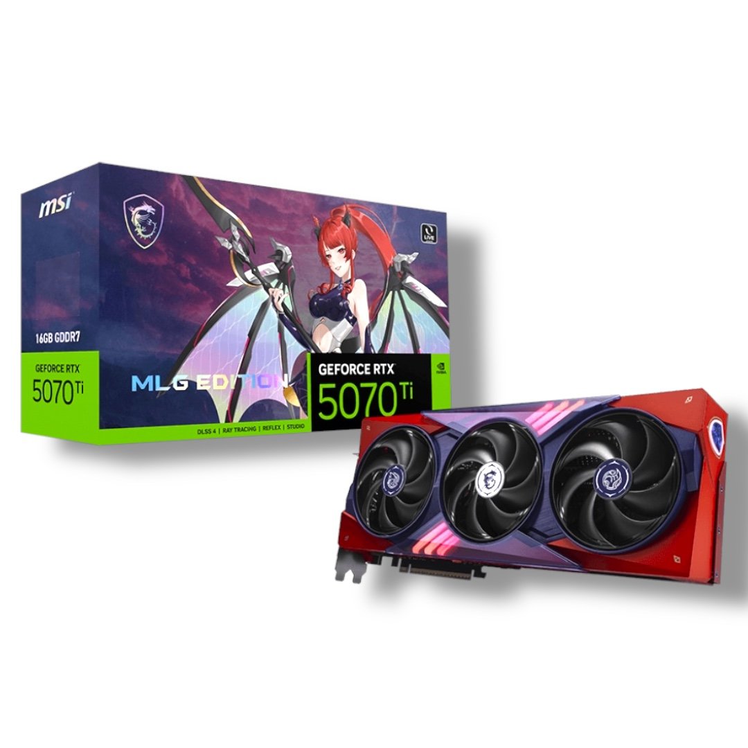 ▸ SKU: 937425 ▸ GPU Model: NVIDIA® GeForce RTX™ 5070 Ti ▸ Edition: GAMING TRIO OC – MLG Edition ▸ Architecture: NVIDIA Blackwell ▸ Memory: 16GB GDDR7 ▸ Memory Interface: 256-bit ▸ Core Clock: Factory Overclocked (OC Mode) ▸ Ray Tracing Cores: 4th Generation ▸ Tensor Cores: 5th Generation ▸ Interface: PCI Express® 5.0 ▸ Outputs: ▸ 3× DisplayPort 2.1 ▸ 1× HDMI™ 2.1 ▸ Maximum Resolution: 8K @ 60Hz ▸ Cooling: MSI TRI-FROZR 3 Thermal Design (Triple Fan) ▸ RGB Support: MSI Mystic Light ▸ Power Connectors: 1× 16-pin (12VHPWR) ▸ Recommended PSU: 850W ▸ DirectX Support: DirectX® 12 Ultimate ▸ OpenGL Support: OpenGL® 4.6 ▸ VR Ready: Yes ▸ Operating System: Windows® 10 / 11 (64-bit) ▸ Form Factor: Full-Size Graphics Card