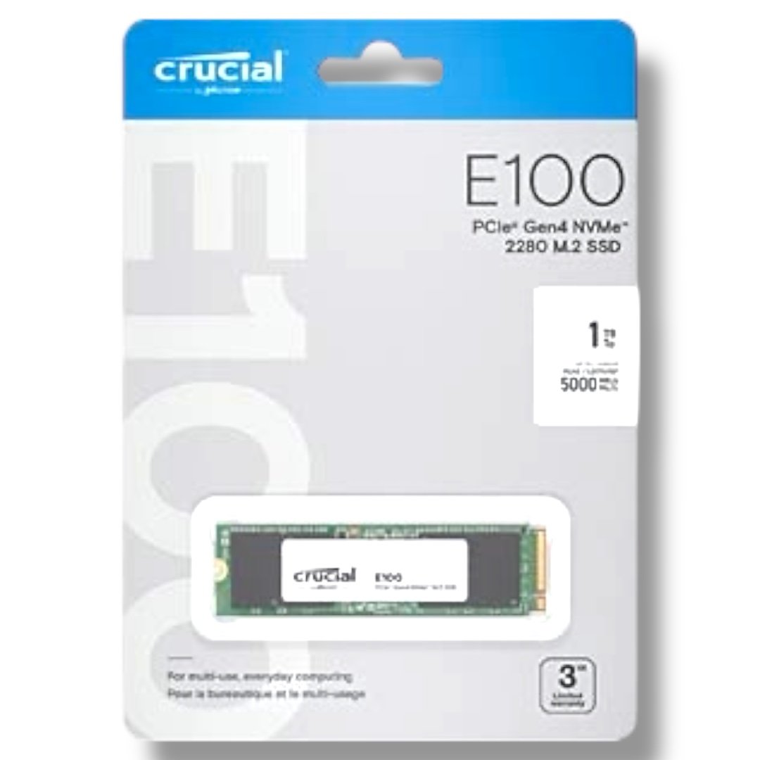 ▸ SKU: CT1000E100SSD8 ▸ Series: Crucial E100 ▸ Interface: NVMe (PCIe Gen4 x4) ▸ Form Factor: M.2 2280 ▸ Capacity: 1TB ▸ Sequential Read: Up to 5,000 MB/s ▸ Sequential Write: Up to 4,500 MB/s ▸ Endurance: 80TBW ▸ Backward Compatibility: PCIe Gen3 ▸ Kit Quantity: 1 ▸ Warranty: 1-Year Limited (or until TBW limit)