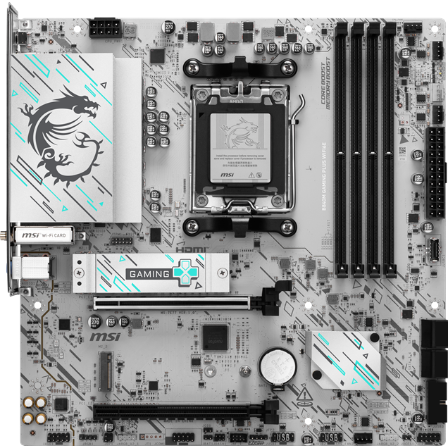 ▸ Socket: AM5 ▸ Chipset: AMD B840 ▸ Form Factor: mATX ▸ Memory: 4× DDR5 (Max 256GB) ▸ Memory Speed: Up to 8000+ MT/s (OC) ▸ Expansion Slots: ▸ 1× PCIe 4.0 x16 ▸ 1× PCIe Gen3 x4 ▸ Storage: ▸ 2× M.2 PCIe 4.0 x4 ▸ 4× SATA ▸ Networking: ▸ WiFi 6E + Bluetooth 5.3 ▸ 2.5G LAN ▸ USB Ports: USB 10Gbps + 5Gbps + Type-C ▸ Display: HDMI 2.1 (4K 60Hz) ▸ Audio: 7.1 HD Audio