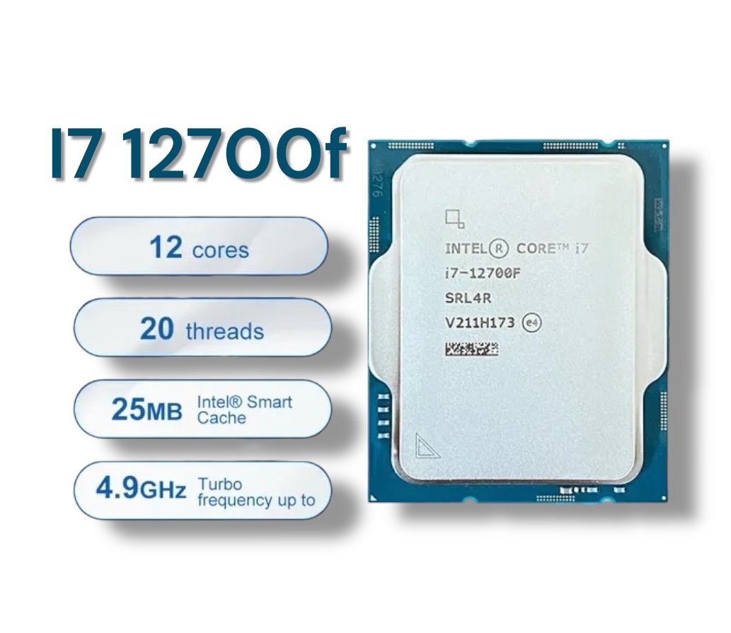 ▸ SKU: I7-12700F-TRAY ▸ Brand: Intel ▸ Series: Core i7 12th Gen ▸ Model: Core i7-12700F (BX8071512700F) ▸ Socket: LGA 1700 ▸ Core Name: Alder Lake Cores / Threads ▸ Total Cores: 12 (8 Performance + 4 Efficient) ▸ Total Threads: 20 Frequencies ▸ P-core Base: 2.1 GHz ▸ E-core Base: 1.6 GHz ▸ P-core Turbo: Up to 4.8 GHz ▸ E-core Turbo: Up to 3.6 GHz ▸ Max Turbo (Intel Turbo Boost Max 3.0): Up to 4.9 GHz Cache ▸ L2 Cache: 12MB ▸ L3 Cache: 25MB Intel Smart Cache Memory Support ▸ DDR5-4800 / DDR4-3200 ▸ Max Memory Size: 128GB ▸ Channels: Dual-channel ▸ Max Bandwidth: 76.8 GB/s PCI Express ▸ PCIe Revision: 5.0 / 4.0 / 3.0 ▸ PCIe Lanes: 16 (Gen 5.0) + 4 (Gen 4.0) Power & Cooling ▸ Base Power (TDP): 65W ▸ Max Turbo Power: 180W ▸ Included Cooler: Intel Laminar RM1 Other Features ▸ 64-Bit Support ▸ Intel Hyper-Threading Technology ▸ Intel Virtualization Technology ▸ Integrated Graphics: None (Discrete GPU required) ▸ Supported OS: Windows 11