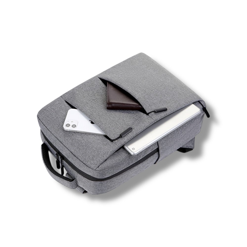 SKU:W012-GREY-EXP007 ▸ Product Type: Laptop Backpack ▸ Material: Waterproof PVC/Nylon ▸ Size: 42 × 12 × 30 cm ▸ Laptop Compartment: Fits up to 15.6″ laptops ▸ Design: Slim, casual, and business-friendly ▸ Special Features: Waterproof, Scratchproof, USB Charging Port ▸ Color Options: Grey, Black, Blue