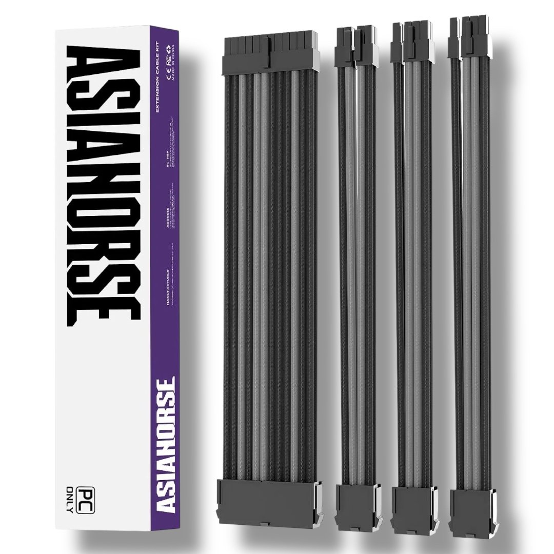 ASIAHORSE 18AWG Black-Grey Extension Kit | 4-Pack Braided Sleeved Cables