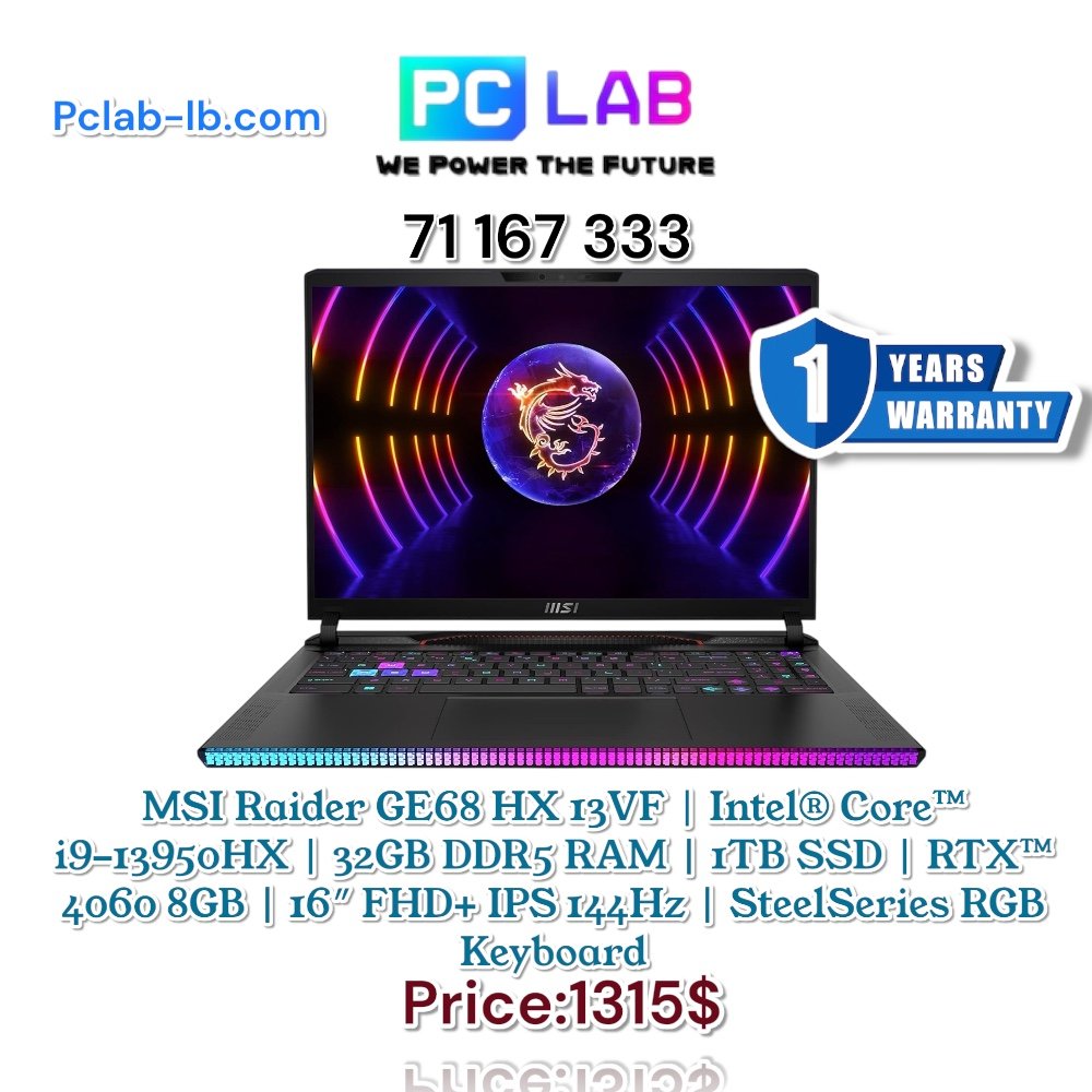 MSI Raider GE68 HX 13VF | Intel® Core™ i9-13950HX | 32GB DDR5 RAM | 1TB SSD | RTX™ 4060 8GB | 16″ FHD+ IPS 144Hz | SteelSeries RGB Keyboard | Windows 11 Home | Black ~ NEW OPEN BOX
