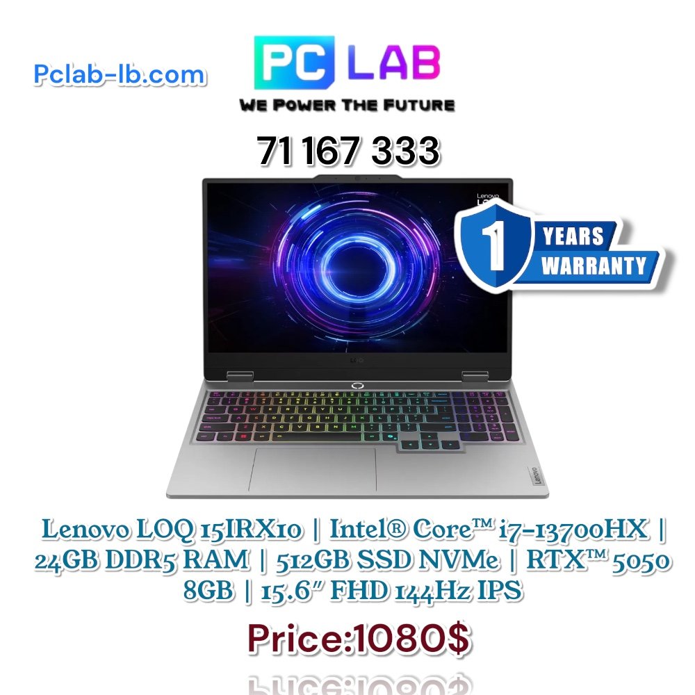 Lenovo LOQ 15IRX10 | Intel® Core™ i7-13700HX | 24GB DDR5 RAM | 512GB SSD NVMe | RTX™ 5050 8GB | 15.6″ FHD 144Hz IPS | White Backlit Arabic/English KB | Luna Grey