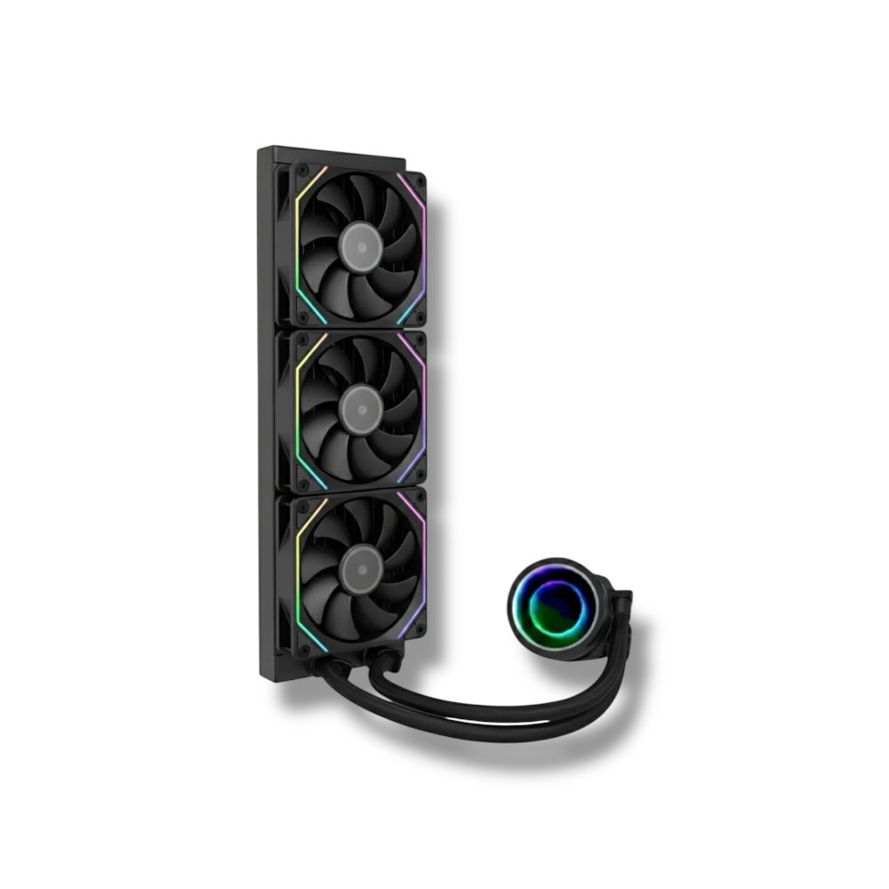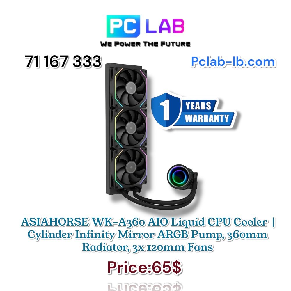 ▸ Brand: ASIAHORSE ▸ Item Name: WK-A360 ▸ SKU: WK-A360-BLACK ▸ Type: 360mm AIO Liquid CPU Cooler ▸ Pump Design: Cylinder Infinity Mirror ARGB ▸ Radiator Material: Aluminum ▸ Radiator Dimensions: 399.5 × 120 × 30 mm ▸ Tubing Length: 385 mm ▸ Fan Configuration: 3 × 120mm Fans (BLACK Blades + ARGB Strip Frame) ▸ Fan Dimensions: 123 × 120 × 25 mm ▸ Fan Speed: 300 ~ 2450 RPM ▸ Fan Airflow: Up to 79.9 CFM ▸ Fan Static Pressure: Up to 3.26 mmH₂O ▸ Fan Bearing Type: Fluid Dynamic Bearing ▸ Fan Noise Level: ~30 dBA ▸ Pump Speed: Up to 3600 RPM ▸ Pump Noise: ~32.1 dBA ▸ Water Block Dimensions: 72.15 × 73.05 × 61.98 mm ▸ Display: None (Infinity Mirror Design instead of LCD) ▸ Color: BLACK ▸ Compatible Sockets: Intel LGA 1851 / 1700 / 1200 / 115x • AMD AM5 / AM4