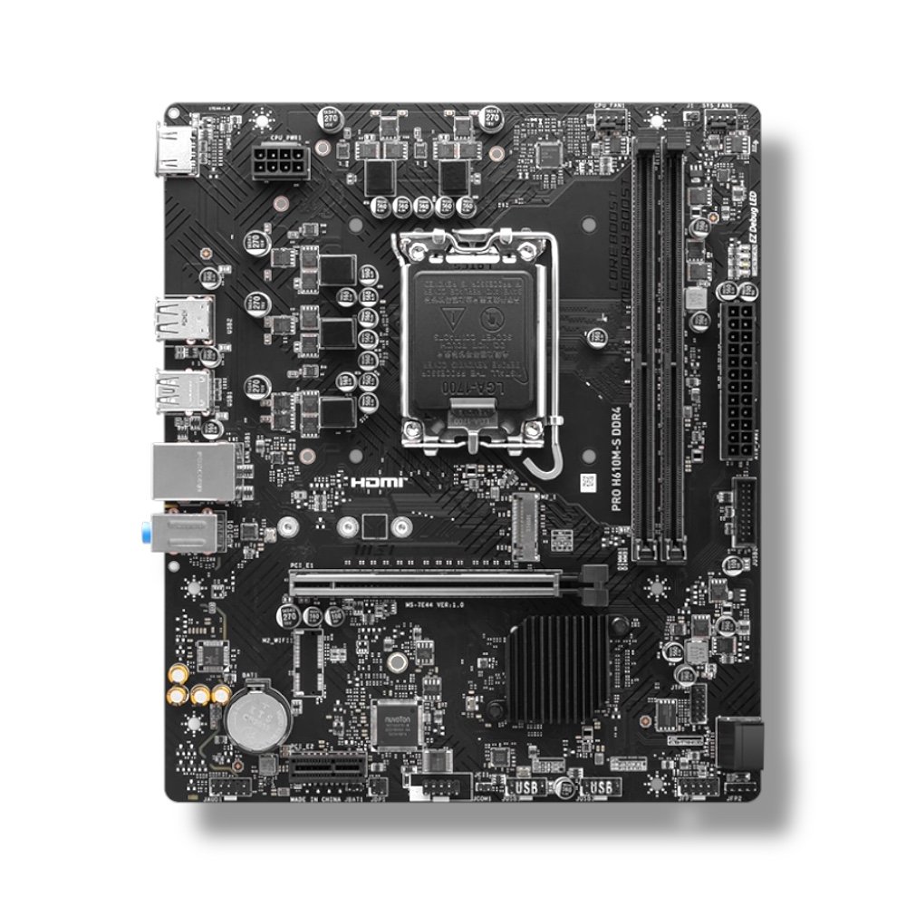 ▸ SKU: 911-7E44-010 ▸ Chipset: Intel® H610 ▸ CPU Support: Intel® Core™ 14th / 13th / 12th Gen, Pentium® Gold & Celeron® (LGA 1700) ▸ Memory: 2× DDR4 slots | Up to 64GB | Dual Channel | 1866–3200MHz (JEDEC) | Non-ECC, unbuffered ▸ Onboard Graphics: 1× HDMI™ 1.4 (4K@30Hz, HDR) — depends on CPU with iGPU ▸ Expansion Slots: 1× PCIe 4.0 x16 | 1× PCIe 3.0 x1 ▸ Audio: Realtek® ALC897 | 7.1-Channel High Definition Audio ▸ Storage: 1× M.2 (PCIe 3.0 x4, 2280/2260/2242) | 2× SATA 6Gb/s ▸ USB Ports: Rear — 2× USB 3.2 Gen1, 4× USB 2.0 | Front — 2× USB 3.2 Gen1, 4× USB 2.0 ▸ LAN: Realtek® RTL8111H Gigabit LAN ▸ Internal I/O: ATX_PWR, CPU_PWR, CPU Fan, System Fan, JFP, JCI, JAUD, JCOM, TPM 2.0 header, USB 2.0 header ▸ LED Feature: 4× EZ Debug LED ▸ Back Panel Ports: HDMI™, USB 3.2 Gen1, USB 2.0, LAN, Audio Connectors ▸ Operating System: Windows® 11 / 10 (64-bit) ▸ PCB Form Factor: mATX (200mm × 236.16mm)