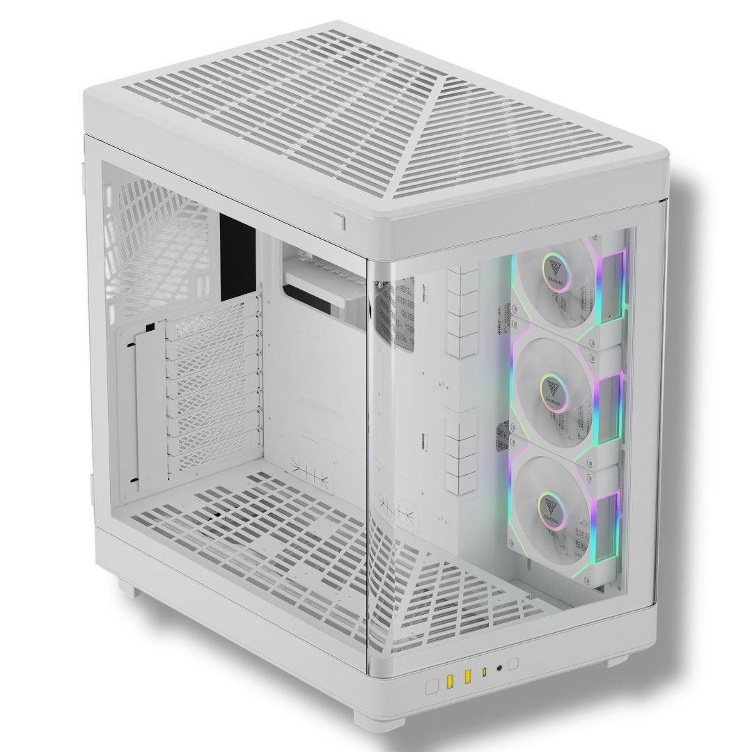 GAMDIAS NESO P1 PRO – Trapezoid Full-Tower Case | Dual Orientation | 3 AEOLUS P2 Fans | 420mm Radiator Support | USB-C | WHITE