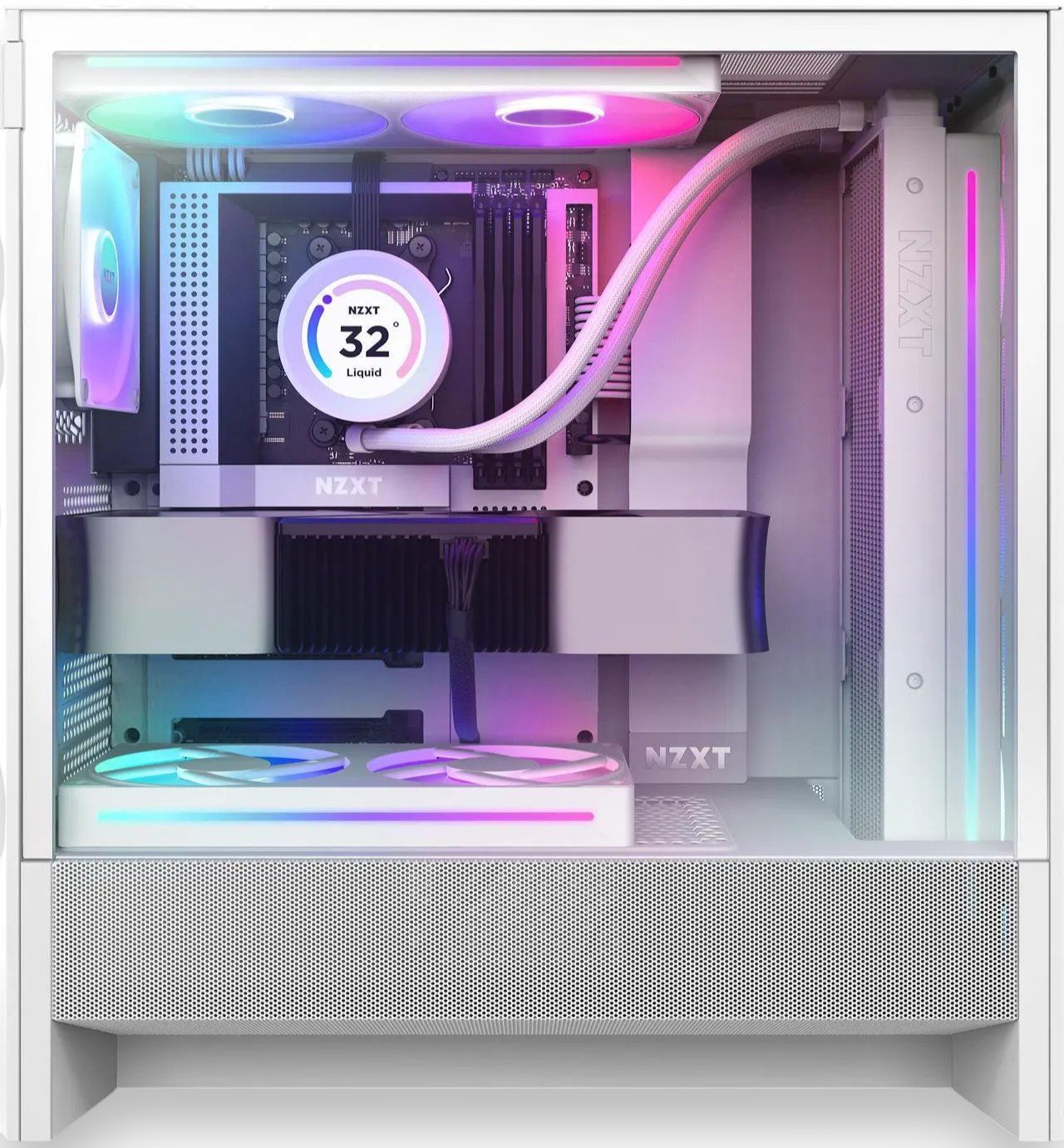 📦 SKU: CC-H52FW-R1 🎯 Features – NZXT H5 Flow RGB 2024 Edition ✔ Enhanced GPU Cooling with Mesh Shroud – Perforated PSU shroud pulls extra cool air from bottom-mounted 120mm fans (not included) to support high-power GPUs. ✔ Ready-to-Glow RGB Fans – Includes pre-installed F360 RGB Core (Front) and F120Q (Rear) fans for vibrant out-of-the-box cooling and lighting. ✔ Radiator-Ready Design – Accommodates a 360mm front radiator and up to 240mm on top (or 280mm with low-profile memory modules). ✔ Ultra-Fine Mesh Panels – Mesh on top, front, and PSU shroud maximizes airflow while filtering dust to keep components clean. ✔ Tool-Less Panel Access – Front, side, and top panels can be removed easily without tools for fast upgrades and cleaning. ✔ Optimized Cable Management – Wide channels, integrated straps, and hooks provide seamless cable routing behind the motherboard tray. ✔ Spacious Interior in Compact Size – Supports GPUs up to 410mm and CPU coolers up to 170mm despite its smaller footprint. ✔ Modern Front I/O – Includes USB 3.2 Gen 2×2 Type-C, USB 3.2 Type-A, and combo audio jack on the top panel. ✔ Durable & Aesthetic Build – SGCC steel with ultra-clear tempered glass in a clean white finish. ✔ Built to Game, Built to Show – Ideal for gaming, streaming, or RGB-themed builds with strong airflow and bold aesthetics. 📊 Specs – NZXT H5 Flow RGB 2024 Edition (White) ▸ Model Number: CC-H52FW-R1 ▸ Case Type: Mid-Tower ▸ Material: SGCC Steel / Ultra-Clear Tempered Glass ▸ Color: White ▸ Motherboard Support: ATX, mATX, Mini-ITX, E-ATX (up to 277mm wide) ▸ Expansion Slots: 7 ▸ Drive Bays: 2×2.5″, 1×3.5″ ▸ GPU Clearance: Up to 410 mm ▸ CPU Cooler Clearance: Up to 170 mm ▸ PSU Clearance: Up to 200 mm ▸ Cable Management Depth: Up to 28.7 mm ▸ Front Fan Support: 3×120mm / 2×140mm (1×F360 RGB Core pre-installed) ▸ Top Fan Support: 2×120mm / 2×140mm ▸ Bottom Fan Support: 2×120mm ▸ Rear Fan Support: 1×120mm (1×F120Q pre-installed) ▸ Front Radiator Support: Up to 360mm ▸ Top Radiator Support: Up to 240mm (280mm with low-profile RAM) ▸ I/O Ports: 1×USB 3.2 Gen 2×2 Type-C | 1×USB 3.2 Type-A | Audio Jack ▸ Included Fans: 1×F360 RGB Core (Front), 1×F120Q (Rear) ▸ Fan Type (Case Version): 3-pin DC ▸ Fan Specs – F360 RGB: 1700±200 RPM, 50.1 CFM, 23.3 dBA, 1.27 mm-H₂O ▸ Fan Specs – F120Q: 1350±150 RPM, 60.2 CFM, 24.1 dBA, 1.05 mm-H₂O ▸ Dimensions (H×W×D): 465 × 225 × 430 mm ▸ Weight: 7.63 kg ⚡ Compact yet powerful mid-tower — built for optimal airflow, RGB aesthetics, and easy customization. Perfect for gaming or streaming builds. 🤍💨💻✨
