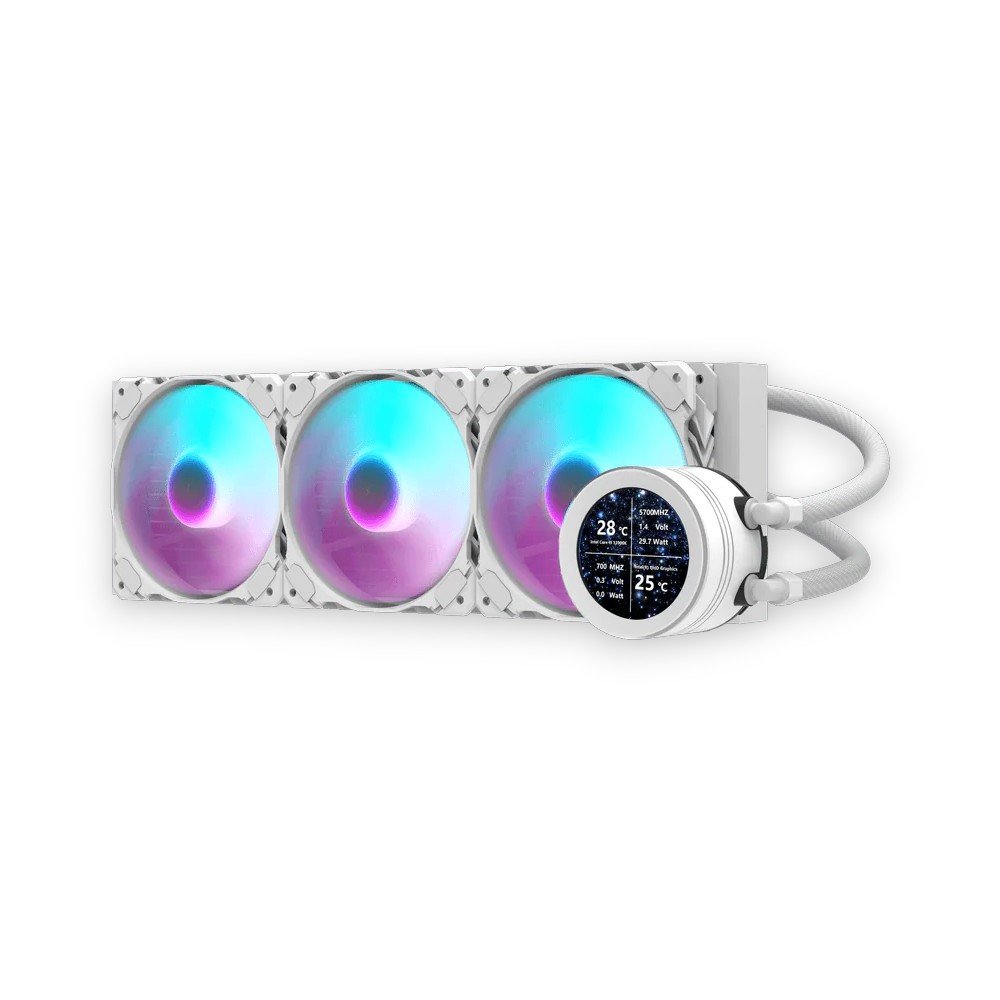 Product Code (SKU): AH-A360-WHITE 🎯 Features – ASIAHORSE 360mm ARGB Liquid Cooler with LCD Display ✔ 360mm High-Performance Cooling – Equipped with 3x120mm ARGB PWM fans, this cooler delivers superior airflow and efficient heat dissipation for high-end CPUs. ✔ 2.8″ IPS LCD Screen – Displays real-time CPU temperature, system stats, or custom animations/videos for a personalized touch. ✔ Premium Copper Cold Plate – Precision-engineered with 81 fins for maximum heat transfer and optimal thermal conductivity. ✔ Silent Yet Powerful Fans – Operates at 600–1800 RPM with noise levels between 21–33dBA, balancing quiet operation with strong cooling performance. ✔ ARGB Lighting Effects – Pump head and fans feature vivid addressable RGB illumination compatible with ASUS Aura, MSI Mystic Light, and GIGABYTE Fusion. ✔ Wide Socket Compatibility – Supports Intel LGA115X/1200/1700/1366/2011/2066 and AMD FM2/FM1/AM3+/AM3/AM2+/AM2/AM4/AM5 sockets. ✔ Durable Tubing Design – 400mm sleeved tubes with 12mm inner diameter for flexibility, durability, and leak protection. ✔ PWM Speed Control – Automatically adjusts fan speed according to CPU temperature for optimized cooling and energy efficiency. ✔ Custom Display Modes – Choose from temperature monitoring or display your own videos/images directly on the LCD screen. 📊 Specs – ASIAHORSE 360mm ARGB Liquid Cooler with LCD Display ▸ Radiator Size: 360mm ▸ Pump Voltage: 12V ▸ Cold Plate Material: Copper ▸ Fans: 3 × 120mm ARGB PWM ▸ Fan Dimensions: 120 × 120 × 26 mm ▸ Fan Speed: 600–1800 RPM (PWM controlled) ▸ Airflow: 65 CFM ▸ Noise Level: 21–33 dBA ▸ Lighting Type: 5V ARGB (3-pin) ▸ Display: 2.8″ IPS LCD (customizable) ▸ Tubing: 400mm length, Ø12.0mm ▸ Material: PC + PBT ▸ Connectors: 4-pin PWM (fans) / 5V 3-pin (ARGB) ▸ Rated Current: 0.3A ±10% ▸ Starting Voltage: 5V ▸ Cooling Capacity: 280W TDP ▸ Intel Sockets: LGA115X / 1200 / 1700 / 1366 / 2011 / 2066 ▸ AMD Sockets: FM2 / FM1 / AM3+ / AM3 / AM2+ / AM2 / AM4 / AM5 ⚡ Powerful performance meets stunning aesthetics — the ASIAHORSE 360mm LCD Cooler keeps your system cool, quiet, and visually mesmerizing. ❄️🌈
