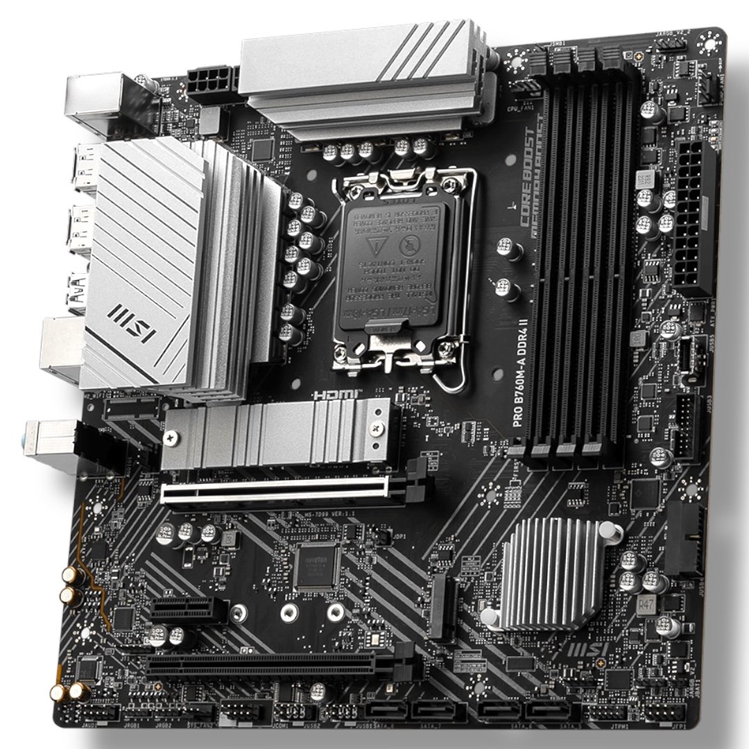 ▸ SKU: 911-7D99-060 ▸ Chipset: Intel® B760 ▸ Socket: LGA 1700 ▸ CPU Support: Intel® Core™ 14th / 13th / 12th Gen, Pentium® Gold, Celeron® ▸ Form Factor: Micro-ATX (243.84 × 243.84 mm) ▸ Memory: • 4× DDR5 DIMM, up to 192GB • Dual-Channel, Non-ECC, Unbuffered • Intel® XMP 3.0 Support ▸ Memory Speeds (OC): 6800+ / 6600 / 6400 / 6200 / 6000 / 5800 / 5600 / 5400 / 5200 / 5000 / 4800 MHz ▸ Graphics Outputs: • 2× HDMI™ 2.1 (4K@60Hz) • 2× DisplayPort 1.4 (4K@60Hz) ▸ Expansion Slots: • 1× PCIe 4.0 x16 (Steel Armor) • 1× PCIe 4.0 x4 (from Chipset) • 1× PCIe 3.0 x1 ▸ Storage: • 2× M.2 (PCIe 4.0 x4 / SATA) • 4× SATA 6Gb/s ▸ RAID Support: RAID 0 / 1 / 5 / 10 (SATA) ▸ Networking: • Realtek® RTL8125BG 2.5G LAN • Intel® Wi-Fi 6E + Bluetooth® 5.3 ▸ Audio: Realtek® ALC897, 7.1-Channel HD Audio (Audio Boost) ▸ USB Ports (Rear): • 2× USB 10Gbps (Gen 2) Type-A • 2× USB 5Gbps (Gen 1) Type-A • 2× USB 2.0 ▸ USB Ports (Front): • 4× USB 5Gbps Type-A • 1× USB 5Gbps Type-C • 4× USB 2.0 ▸ Internal Headers: ATX_PWR, 2× CPU_PWR, CPU Fan, Pump Fan, 2× System Fan, 2× JFP, JCI, JAUD, JCOM, 2× JARGB_V2, 1× JRGB, TPM 2.0 ▸ Cooling & Thermal: Extended Heatsink, 7W/mK Pads, M.2 Shield Frozr, 3A Pump Header ▸ Debug: 4× EZ Debug LEDs ▸ Operating System: Windows® 11 / 10 (64-bit) ▸ Warranty: 1 Year Limited Warranty ▸ Box Contents: B760M Gaming Plus WiFi Motherboard, Wi-Fi Antennas, SATA Cables, IO Shield, Quick Install Guide