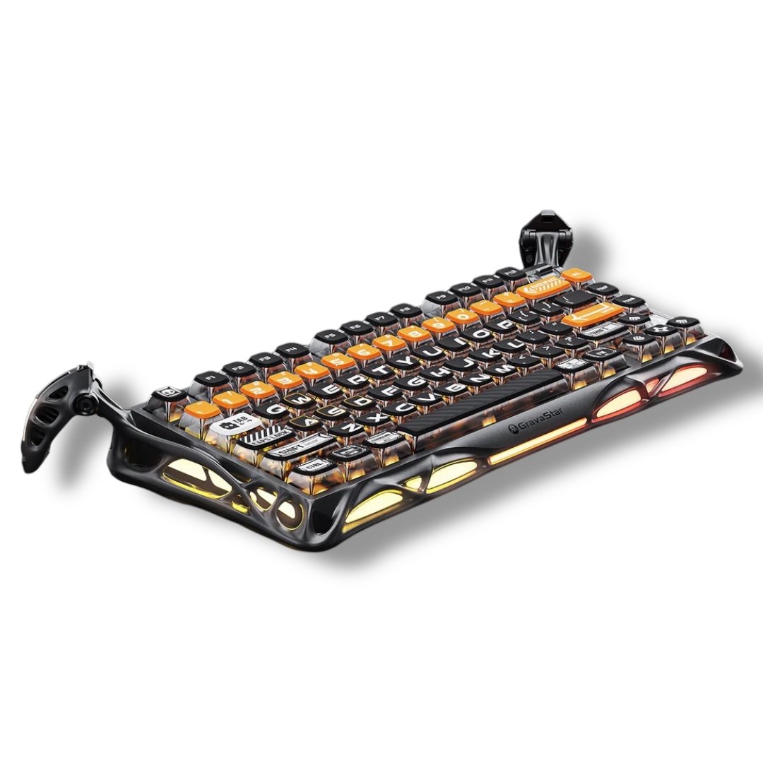 ▸ SKU: 506020-MERCURY-K1 ▸ Product Name: GravaStar Mercury K1 Pro – CyberFlare ▸ Keyboard Layout: 75% ▸ Key Count: 79 Keys + Rotary Knob ▸ Material: Glossy Aluminum Alloy ▸ Mounting Structure: Gasket-Mounted FR4 Plate ▸ Sound Dampening: 5-Layer Foam System ▸ Switch Type: GravaStar × Kailh Speedy Mint Linear ▸ Actuation Force: 45gf ▸ Pre-Travel Distance: 1.2mm ▸ Total Travel Distance: 3.5mm ▸ Hot-Swap Support: 3-Pin & 5-Pin Switches ▸ RGB Lighting: Dual Independent RGB Systems ▸ Lighting Colors: 16.8 Million ▸ Lighting Modes: 13 ▸ Battery Capacity: 8000mAh Rechargeable Battery ▸ Connectivity: Wired / Bluetooth / 2.4GHz Wireless ▸ Operating System: Windows OS & macOS ▸ Dimensions (L × W × H): 415 × 178.6 × 57.6 mm ▸ Weight (With Battery): 1.18 kg ▸ Warranty: 12-Month Limited Hardware Warranty