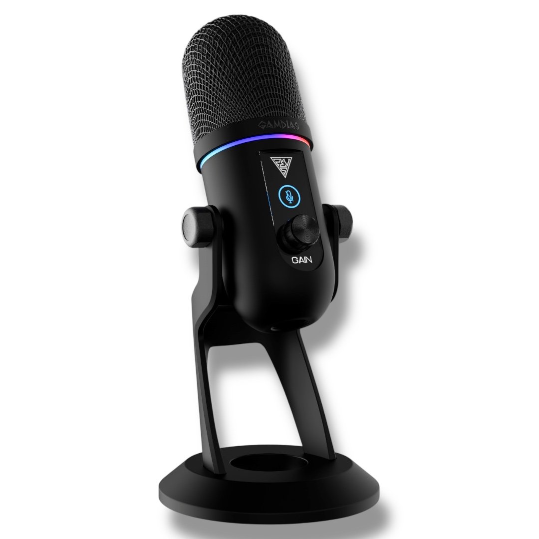 Professional USB microphone designed for gaming, streaming, and voice recording, featuring supercardioid pickup, RGB lighting, and real-time monitoring for clear and focused sound.