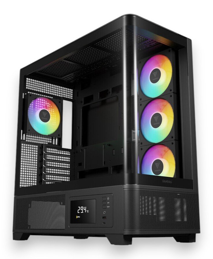 ATX case featuring a unique hybrid side panel, digital temperature monitoring, and pre-installed ARGB fans. supports large GPUs
